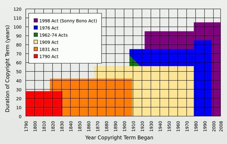 In the U.S., the duration of copyright protection has gotten longer over time. It started at a maximum of 28 years, then it went up to 42 years, then 56 years, and on and on.