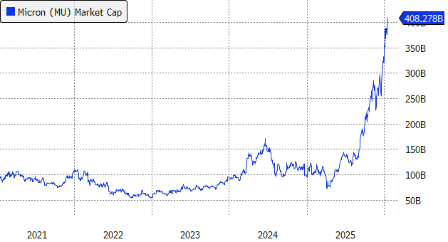 An unexpected company has become one of the hottest stocks in the market. With a market cap that recently crossed $400 billion, Micron Technology has climbed roughly fourfold from where it traded a year ago and now sits among the top 20 companies in the S&P 500.