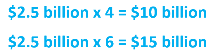 If we put a 4x multiple on Twitter’s $2.5 billion of revenues, we get a valuation of $10 billion. And if we use a 6x multiple, we get $15 billion.