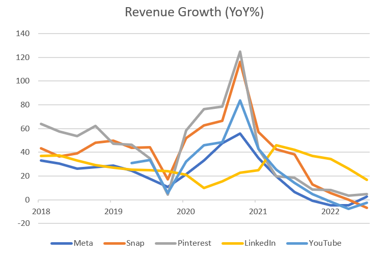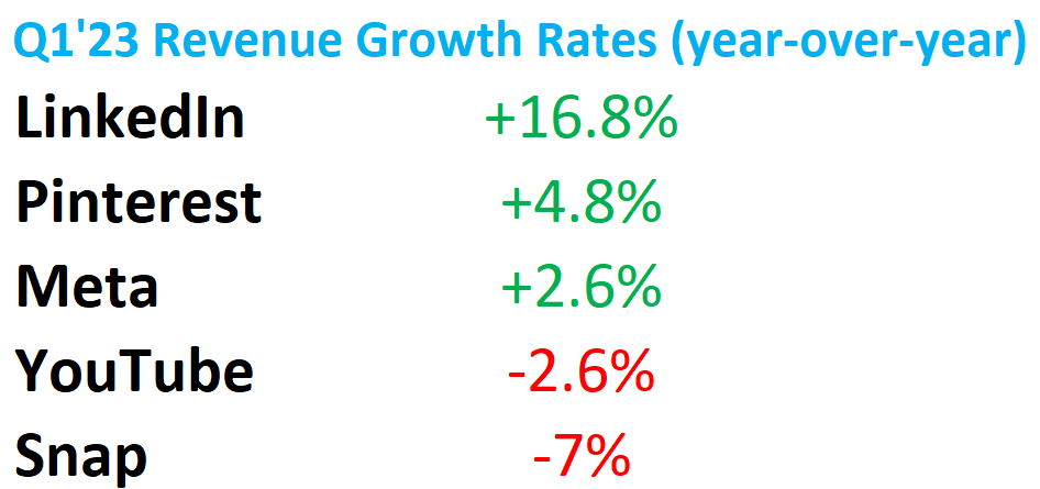 Revenues for Meta, LinkedIn and Pinterest are still going up, just at a slower pace. While revenues for YouTube and Snap are down, but only around 2% to 7%.