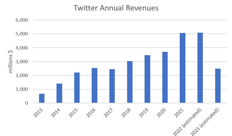 But we have an idea. If what Elon said about the 50% drop in revenues is true, then Twitter is on track to make around $2.5 billion in revenues this year, compared to just over $5 billion last year.