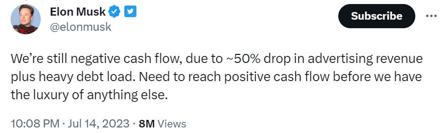 Now, as Elon alluded to in his tweet, Twitter is not a profitable company today. Even though the company has cut costs by billions of dollars, it’s still burning cash.