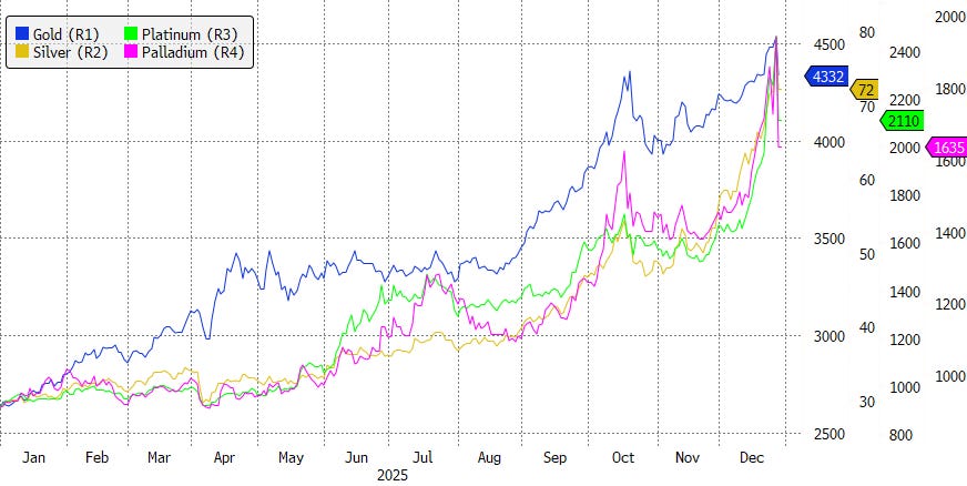 This isn’t just a silver story, or even a silver-and-gold story. Platinum and palladium have surged as well. If this rally were primarily about silver-specific fundamentals, it would be hard to explain why metals with very different demand profiles are all exploding at the same time.