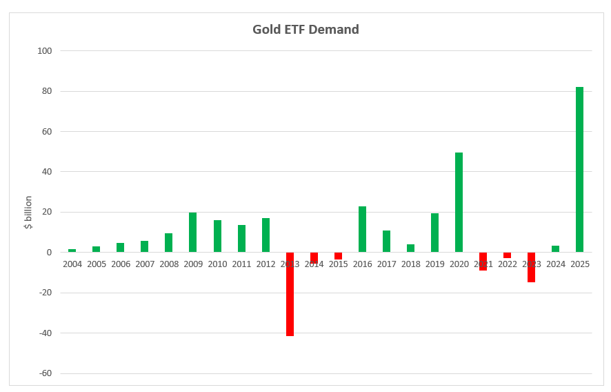 This year, gold ETF demand is following a similar pattern, just on a much larger scale. Roughly $82 billion has flowed into gold ETFs globally so far, by far the largest dollar amount on record.