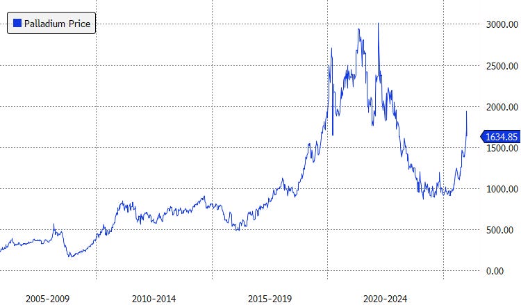 But eventually, substitution, weaker auto demand, and improving supply ended the squeeze. Palladium is still roughly 50% below its all-time high, despite this year’s rebound.