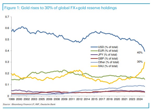 According to Deutsche Bank, gold now makes up roughly 30% of global foreign-exchange reserves, up from about 15% just a few years ago. The U.S. dollar remains the largest reserve currency at around 40%, but its share continues to shrink.