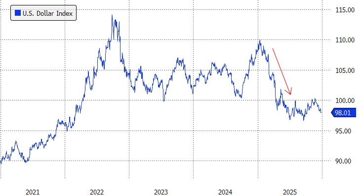 Personally, I think a major catalyst this year was the trade war and tariff escalation that unfolded early in 2025. The dollar fell sharply during that period and remains down nearly 10% on the year.