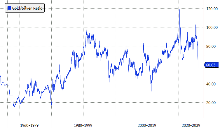 The gap became extreme. The gold-to-silver ratio, which measures how many ounces of silver it takes to buy one ounce of gold, surged to a modern-day record high of about 120.