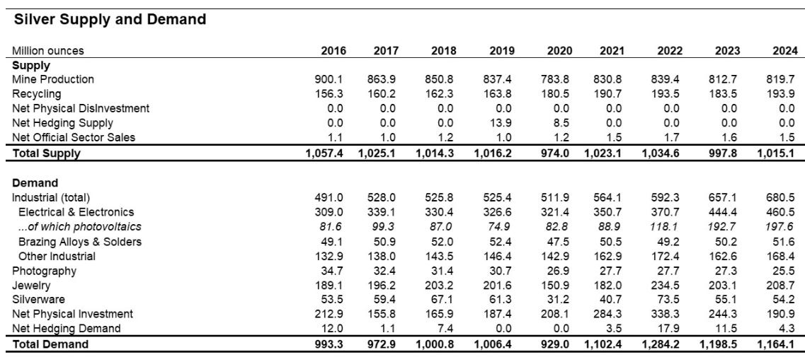 Solar demand for silver has grown rapidly. Photovoltaic consumption more than doubled from roughly 89 million ounces in 2021 to about 198 million ounces in 2024, making solar responsible for around 17% of total silver demand, according to The Silver Institute. That share has been climbing steadily as solar installations expand globally.