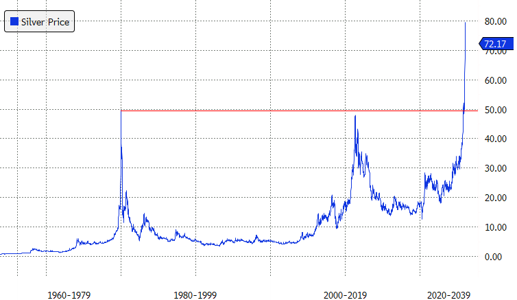 Some investors believe that momentum will continue. Silver’s breakout above $50 cleared a long-standing ceiling from 1980 and 2011, a move that technical traders see as opening the door to much higher prices.